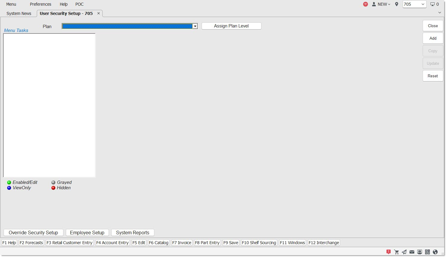 Menu Path: Controls, System, Plan Level Security, PLAN LEVEL SECURITY screen