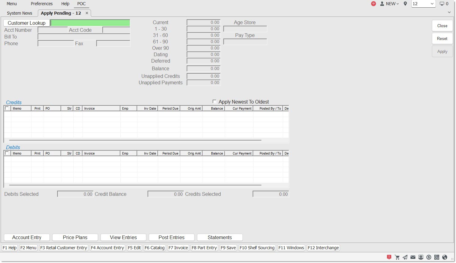 The Apply Pending screen is used to apply credits that exist on the account but have not yet been applied. Used for Open Item accounts only.