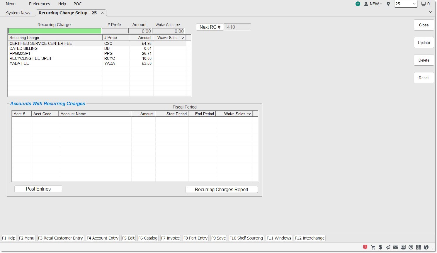 Once Recurring Charges are set up, they can be enabled, per account, from the POST ENTRIES screen.