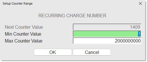 Click the 'NEXT RC #' button to display the 'SETUP COUNTER RANGE' window used to assign and track Recurring Charge numbers.