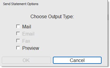 When an account is selected and the 'Statement' button is clicked, the 'Send Statement Options' window displays to select the output type. The window populates based on the selected customer or store's account settings. For instance, if the selected customer or store account setting has mail selected, the 'Mail' output type defaults to checked.