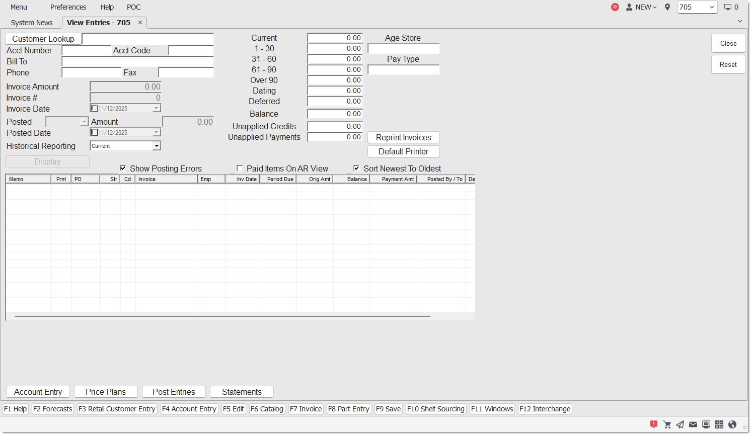 Displays the invoice date. Click the small down arrow to display a calendar. Click the desired date to select. Use the small left and right arrows to display previous / next months. With an account in focus, click 'Display' to initiate the search. Invoices with debits and credits that meet the criteria display in the grid.
