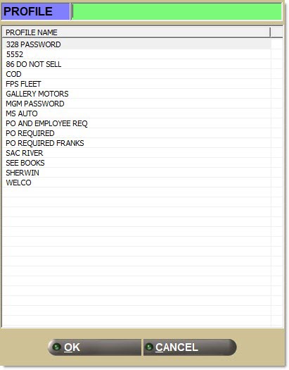 The Profile Parameter Setup screen is used to set up and maintain certain criteria that forces data to be entered at Point-of-Sale before a sale is allowed for certain customers. Profiles can be linked to all primary or main accounts. If a profile is linked to an account, as soon as that account is entered at Point-of-Sale, the Profile Parameter Setup screen displays to allow entry of necessary data.