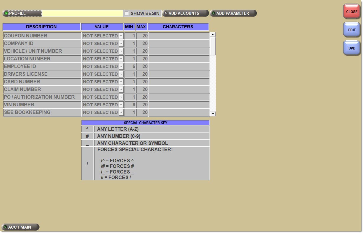 Sets the characters that can optionally or forced to be entered in the 'Profile Data' pop-up per selected 'Description' field at Point-of-Sale. Use the 'Special Character Key' chart to determine what data can optionally be entered.