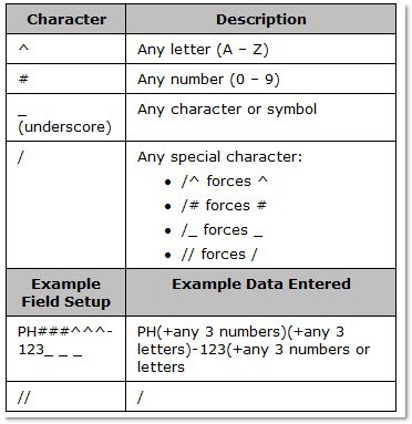 Identifies the special characters that can be optionally entered in the 'Characters' field.