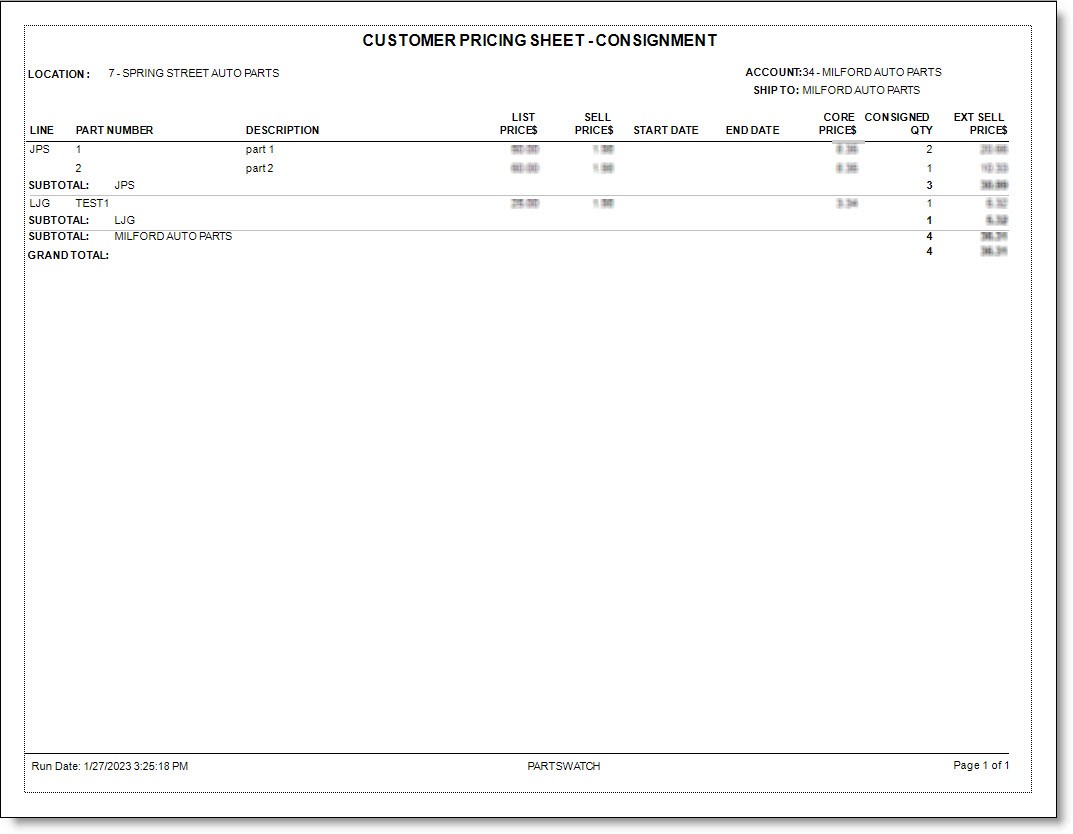 - 'CONSIGNED PRICE SHEET' – Used to output consignment pricing for an account with consigned inventory.