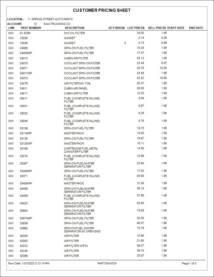 The following is an example of the 'CUSTOMER PRICING SHEET' report output: