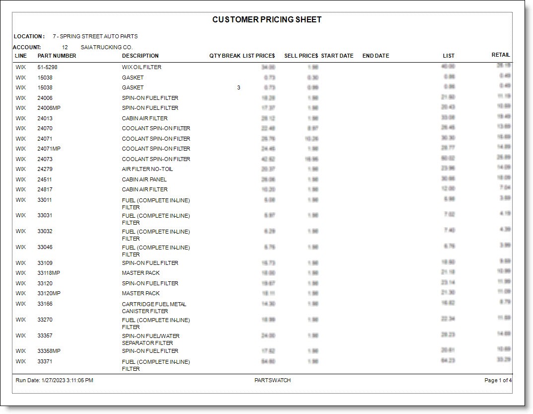 Customer Pricing Sheet Report