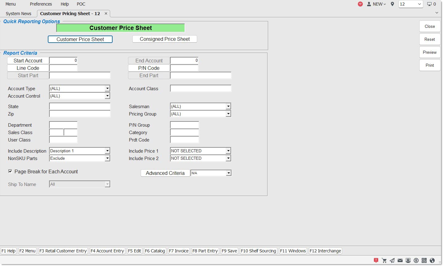 The CUSTOMER PRICING SHEET screen is used to view pricing based on PRICE PLAN SETUP for certain lines for one or more accounts, and to provide a pricing sheet for customers who want to see their pricing for a line or lines that they normally buy from the store. The CONSIGNED PRICE SHEET is output from the same screen and used to output consignment pricing for an account with consigned inventory.