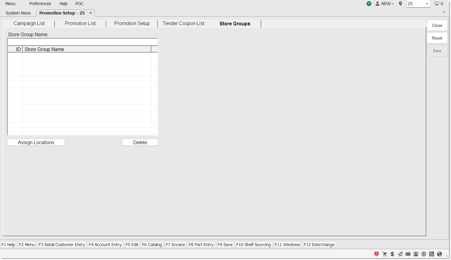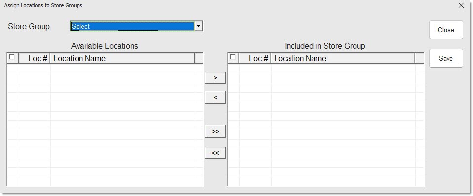 When clicked, opens the 'Assign Locations to Store Group' window allowing the assigning of stores to the "promotional" store group.