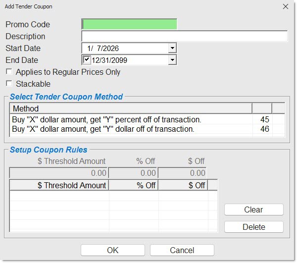 Click the 'Add' button the 'Add Tender Coupons' window opens, allowing the creation of tender coupons.