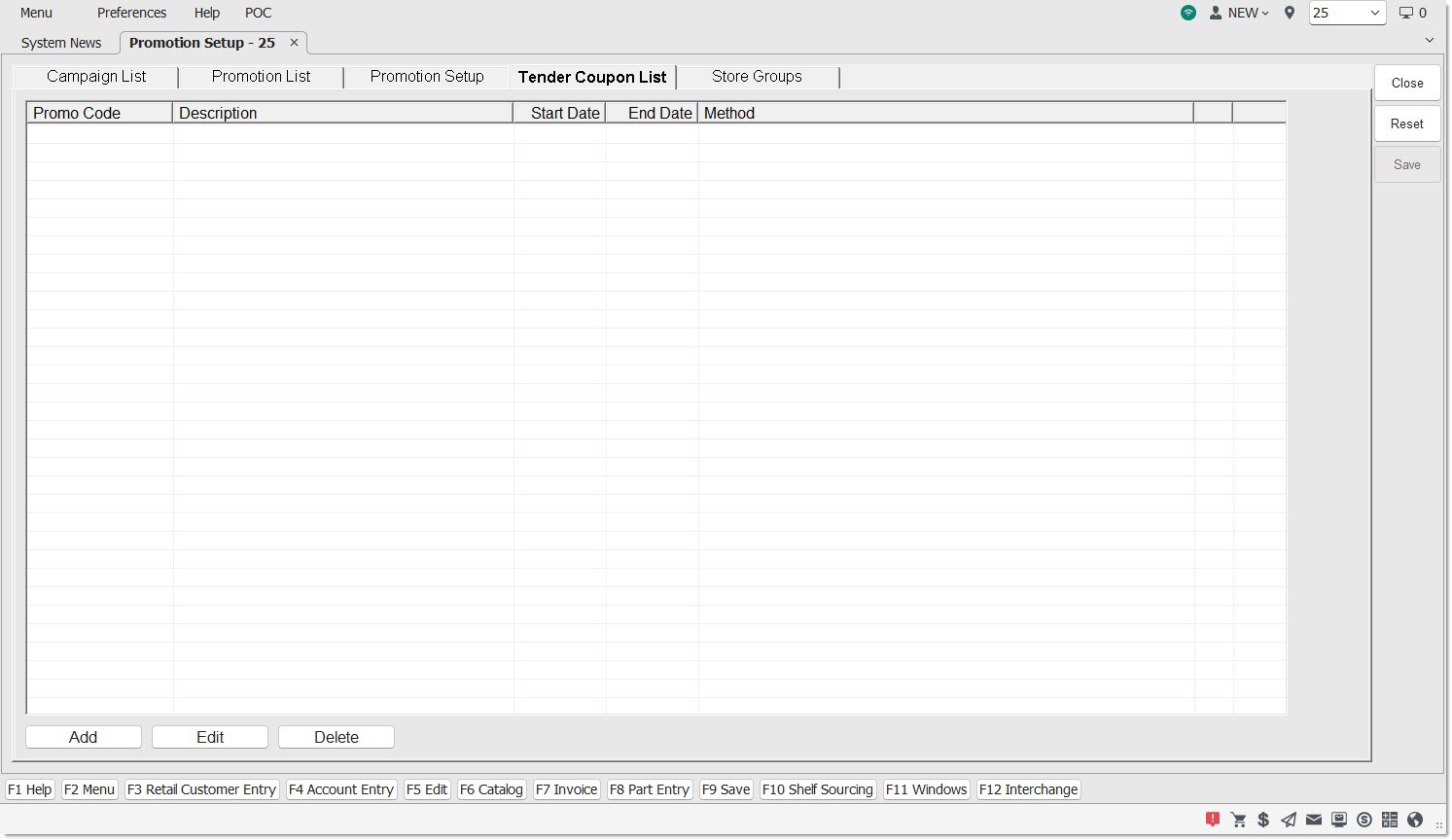 The 'Tender Coupon List' tab is used to add, edit, and delete all tender coupons.