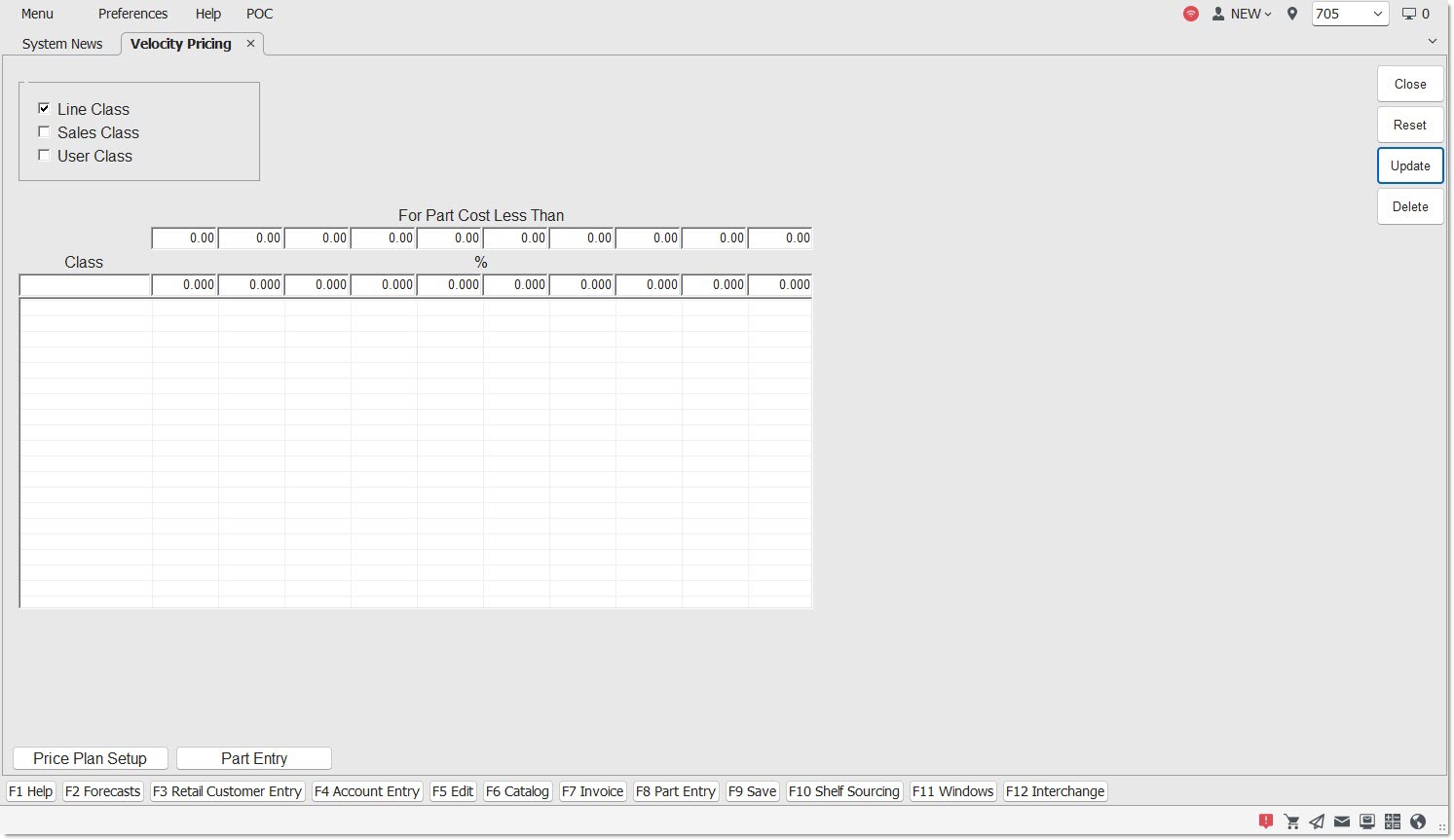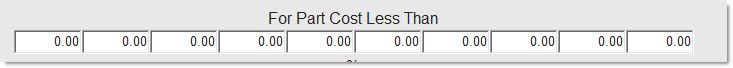 Enter the upper-most price level boundaries. All parts whose cost falls between one level and the previous / next column’s level receives a price adjustment equal to the value (%) listed in that column for the particular part’s selected class code. The value is numeric from .01 to 9999999.99.