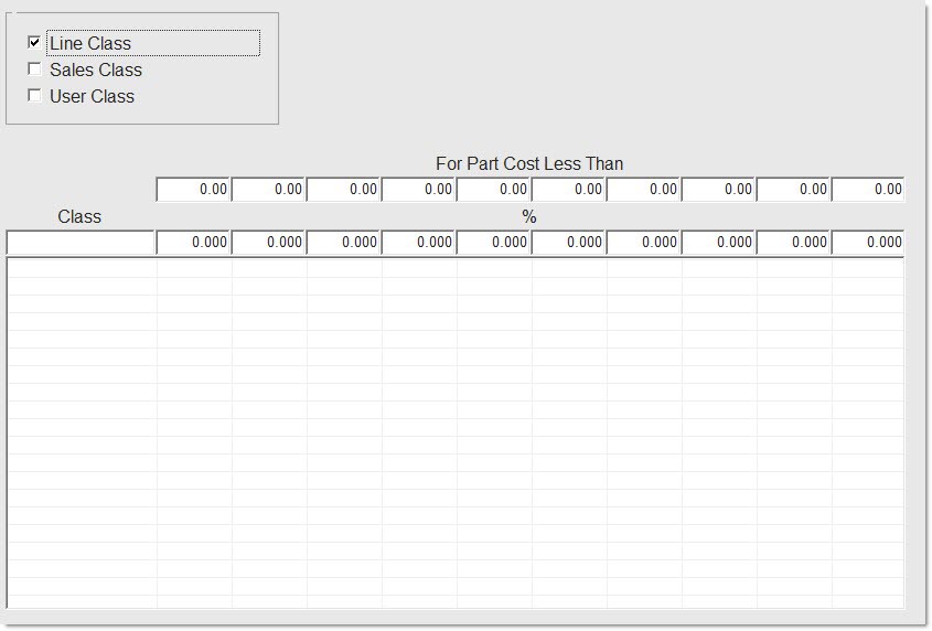 In each row, enter the class code and each percent (%) across the row that will be used to calculate pricing for all parts with that class code that are priced using the 'LESS THAN' setup. Up to three decimal places are supported.