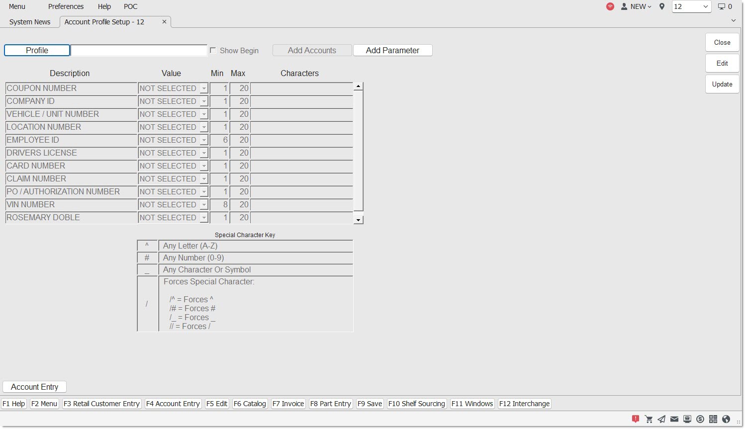 Sets the characters that can optionally or forced to be entered in the 'Profile Data' pop-up per selected 'Description' field at Point-of-Sale. Use the 'Special Character Key' chart to determine what data can optionally be entered.