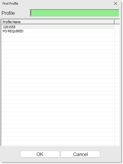 The 'Profile' button displays the 'Find Profile' window used to locate an existing profile setup. Select the desired profile and click 'Ok'.