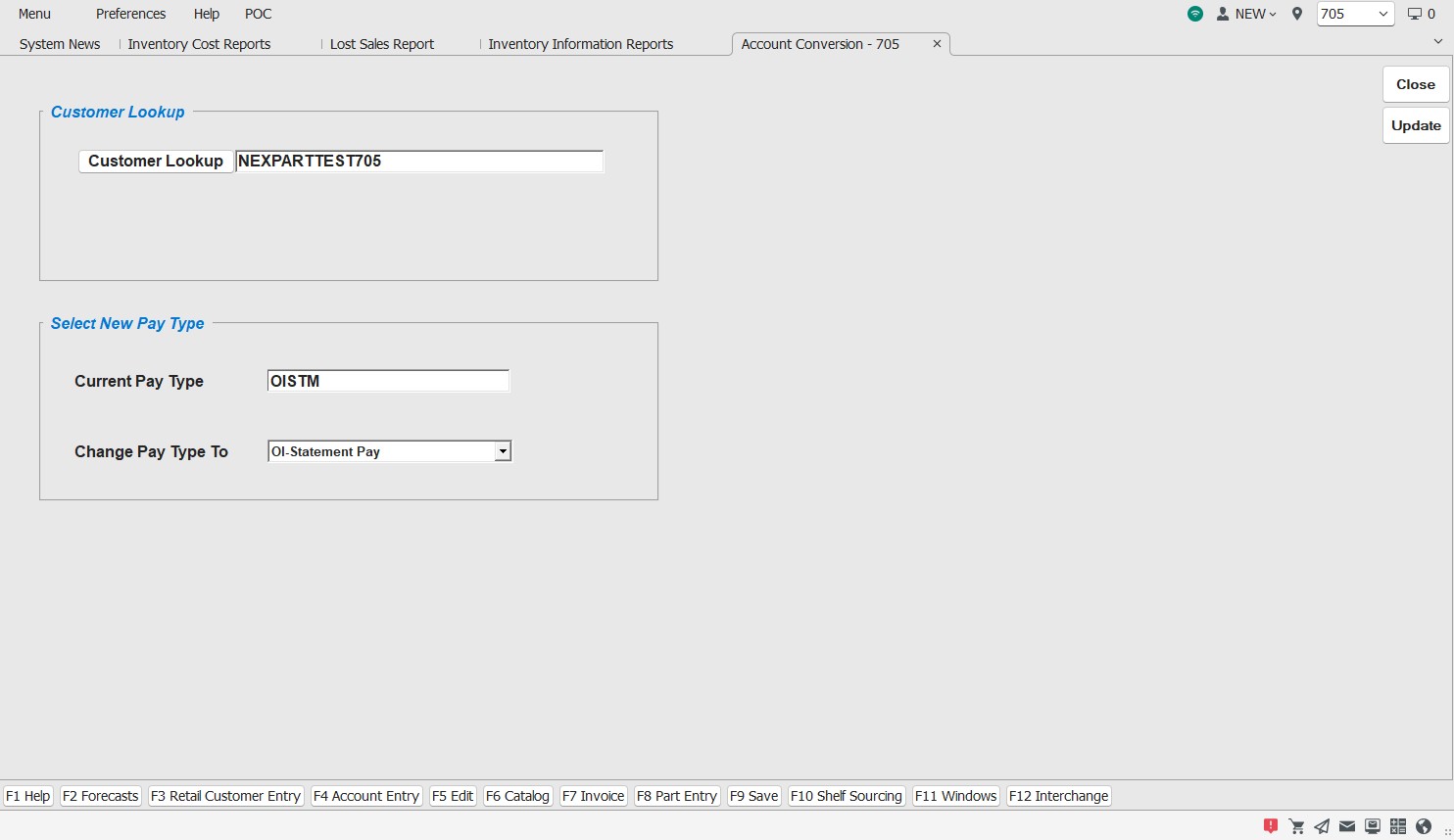 The ACCOUNT CONVERSION screen is used to change/convert the account 'PAY TYPE' from 'BALANCE FORWARD' to 'OPEN ITEM' or vice versa if needed.