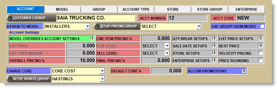 In order to use pricing setups in customer pricing calculations, a number of setups must be enabled for the customer on the 'ACCOUNT' Mode tab, 'Account Settings' or the 'MODEL' Mode tab, 'Model Settings' if a Model has been selected in the 'ASSIGN TO MODEL' field and the 'MODEL OVERRIDES ACOUNT SETTINGS' flag is checked: