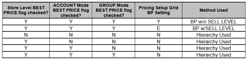 When using the hierarchical method, the system looks at all setups in order of highest to lowest in the priority of the way the modes are displayed. And, when using the best price method, it only considers rows with the BP flag set to ‘Y’ or ‘E’, and of those, the lowest or best price will be used.