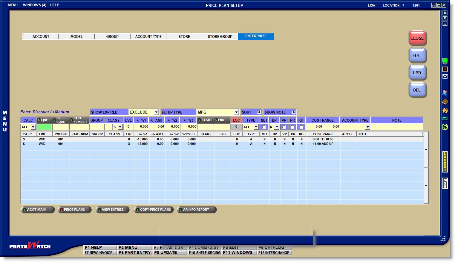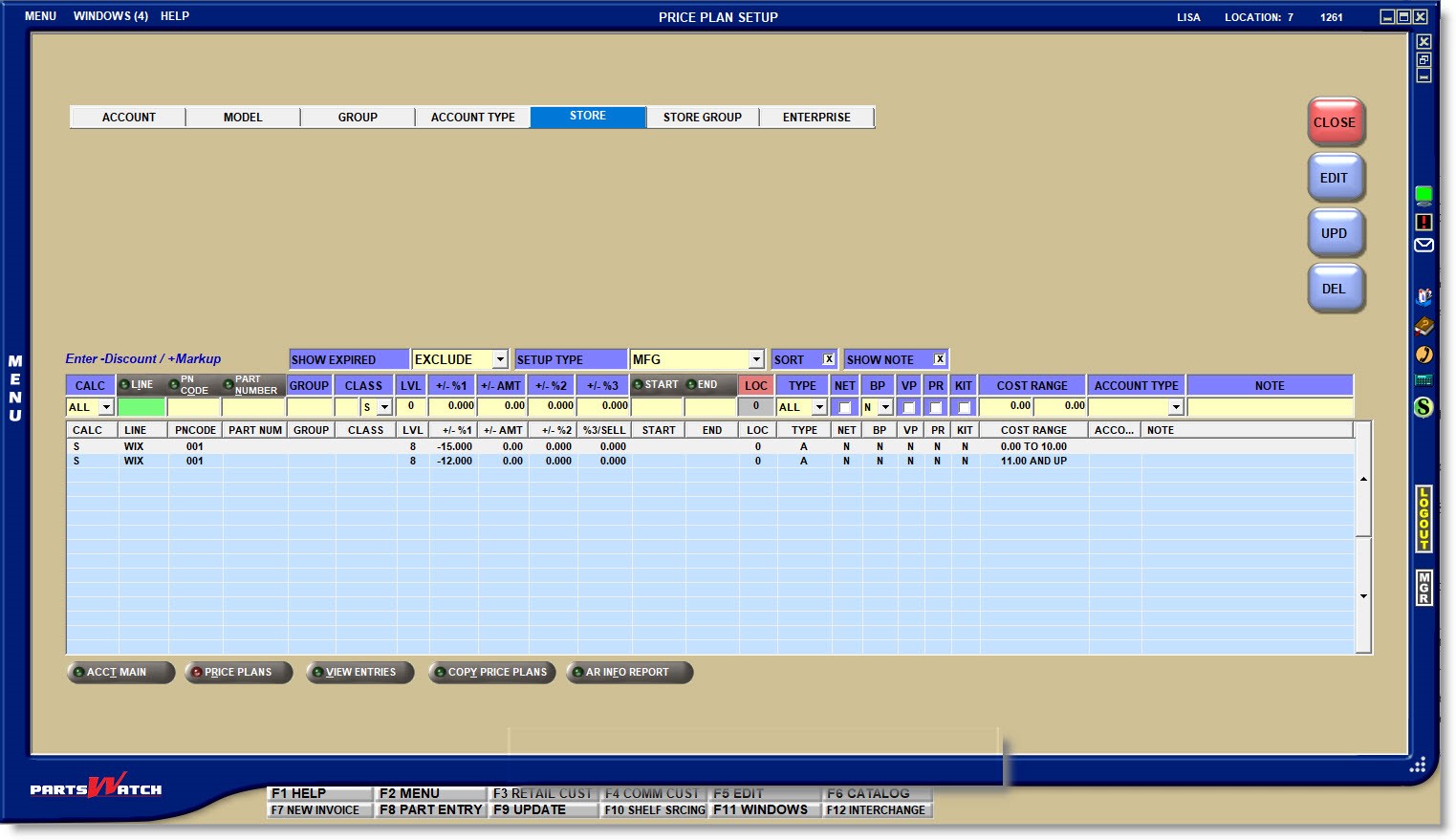 The hierarchy method always uses the first grid setup found for the part entered at Point-of-Sale and does not look any further once it finds one. As setups are entered for the same line, the system orders the rows in the grid by priority, regardless the order they are entered in, so that any setups for a single part number is ordered first, then for a 'PN CODE', 'CLASS CODE', 'GROUP' Code, and finally the whole line. This method guarantees when the system looks for at price at Point-of-Sale, it will find the right setup.