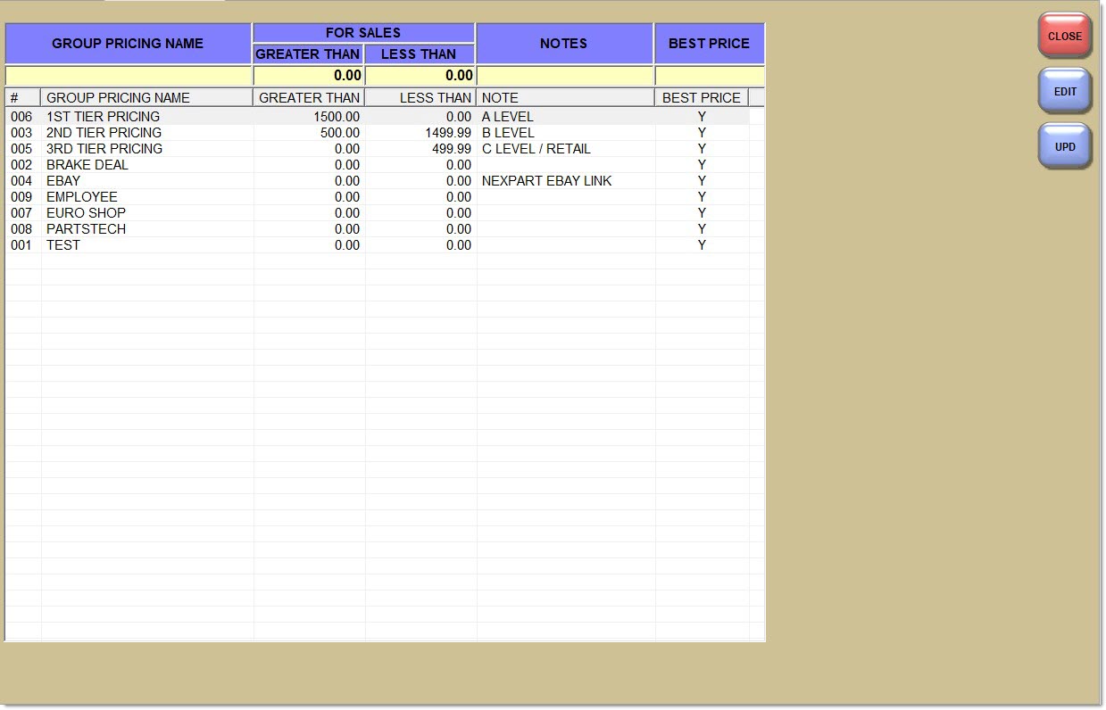 Pricing Groups can be set up to divide the customer base into various divisions for pricing discounts and reporting and are set up from the 'GROUP' Mode tab or from the 'SETUP PRICING GROUP' button on the 'ACCOUNT' Mode tab.