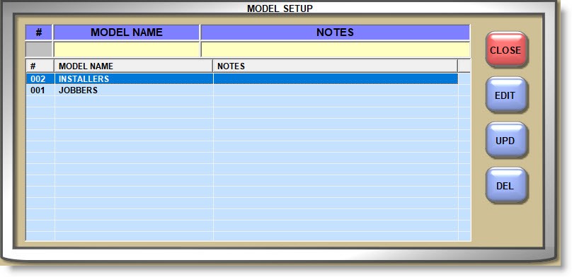 "Models" are optionally set up from the 'MODEL' Mode tab to provide the same pricing parameters used by multiple accounts that are priced the same way. This way, a Model can be set up or edited once and all customers assigned to the Model are affected at the same time.