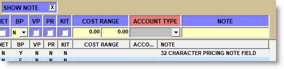 Check the 'SHOW NOTE' field above the grid and a ‘NOTE’ field is enabled in the pricing grid. The field allows up to 32 alphanumeric and special characters and can be optionally used to enter a note about the setup, for example, "filters only" or "winter special" as a reminder.