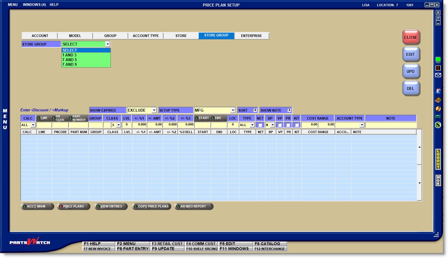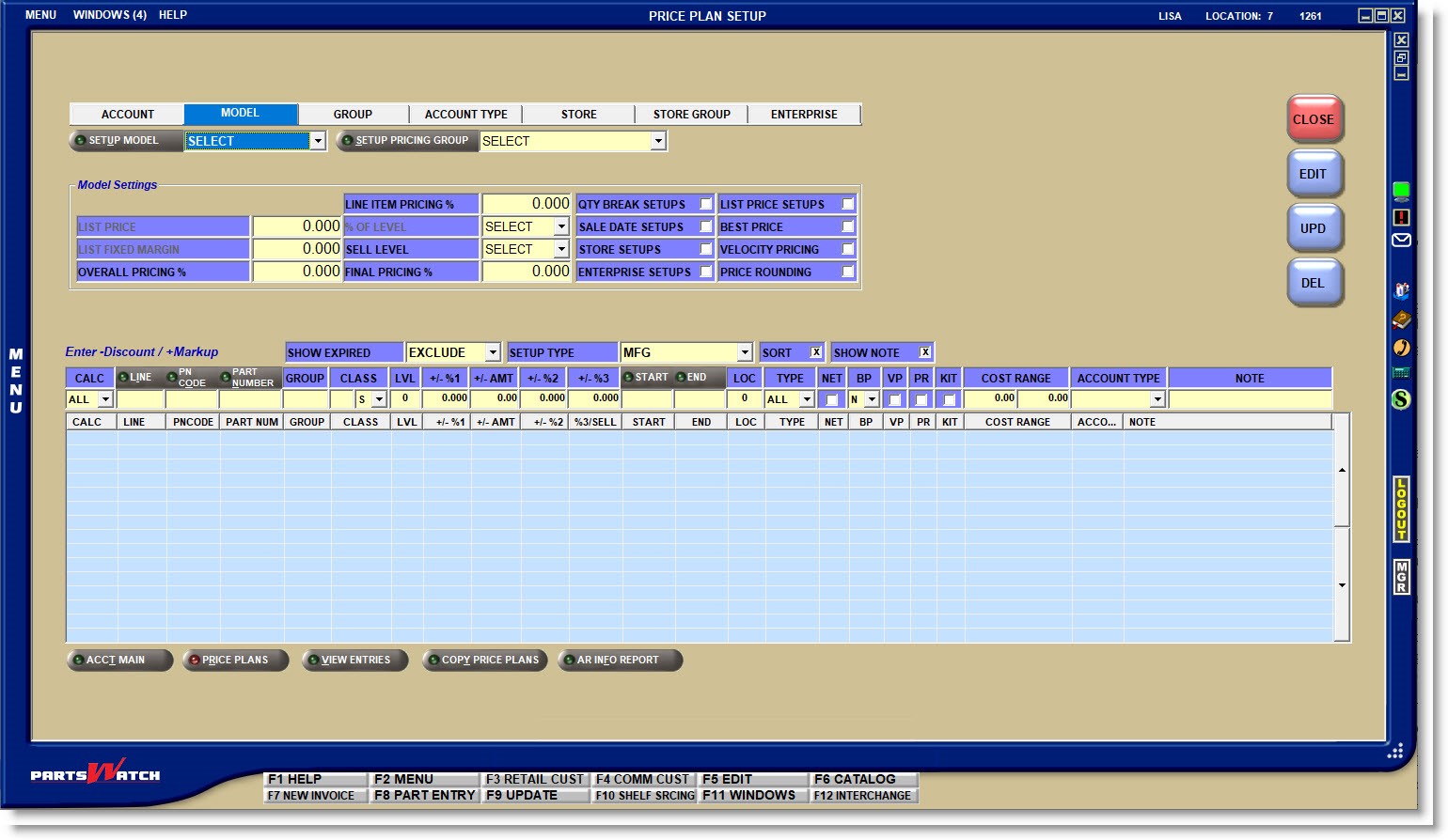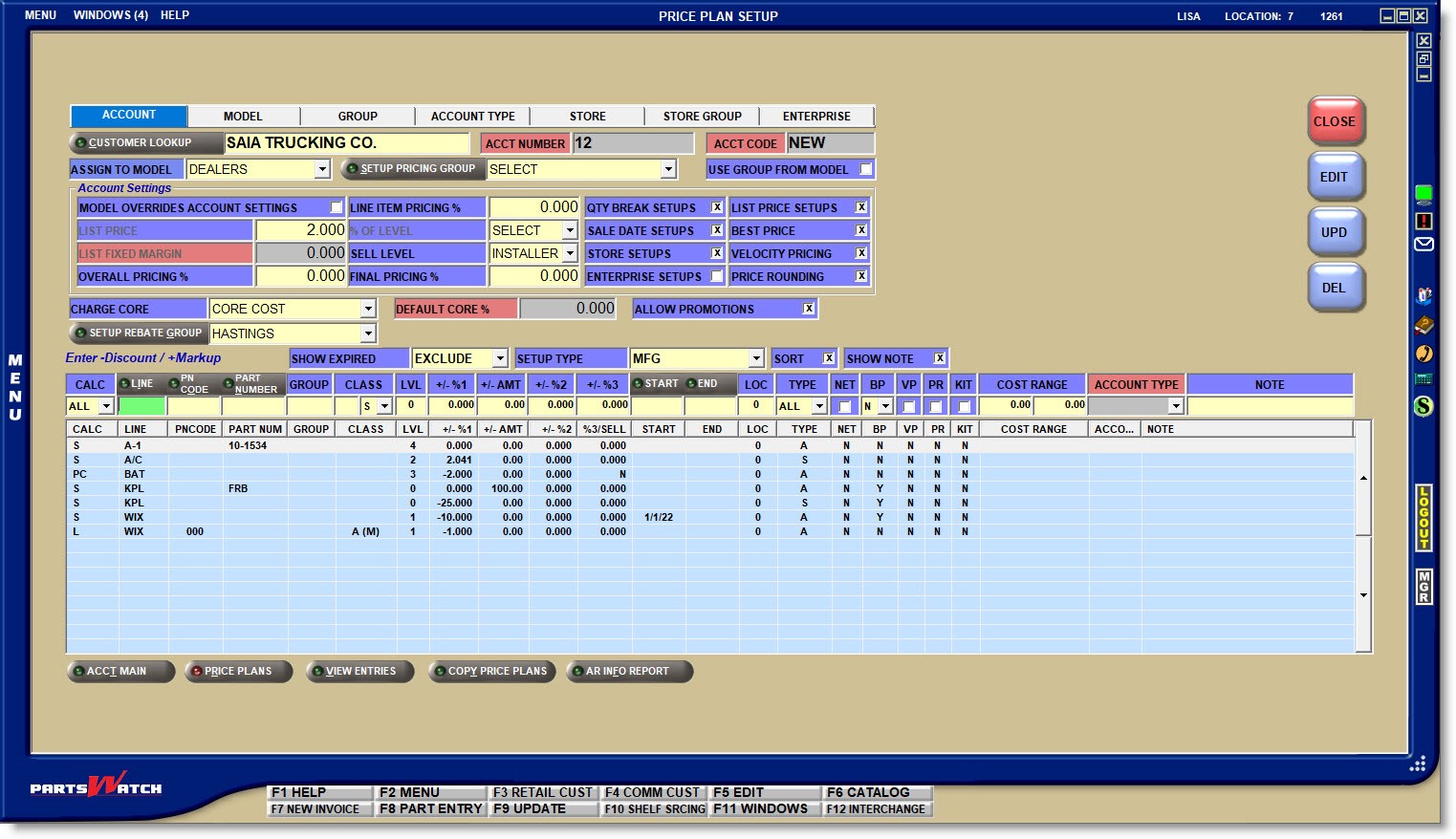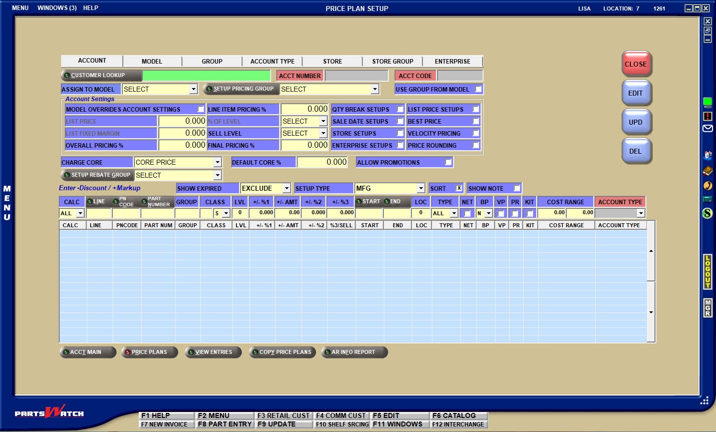 Menu Path: Customers, Accounts, Account Pricing, Price Plan Setup, PRICE PLAN SETUP screen