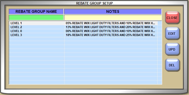 Rebates can be optionally tracked for manufacturers that offer a Rebate program, and are established in the REBATE SETUP screen. Accounts are assigned to Rebate Groups to determine their rebate percentage which is usually a percent returned to the store by the manufacturer if sales are at or below a certain profit margin.