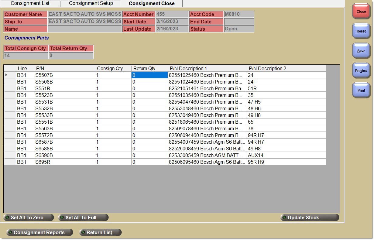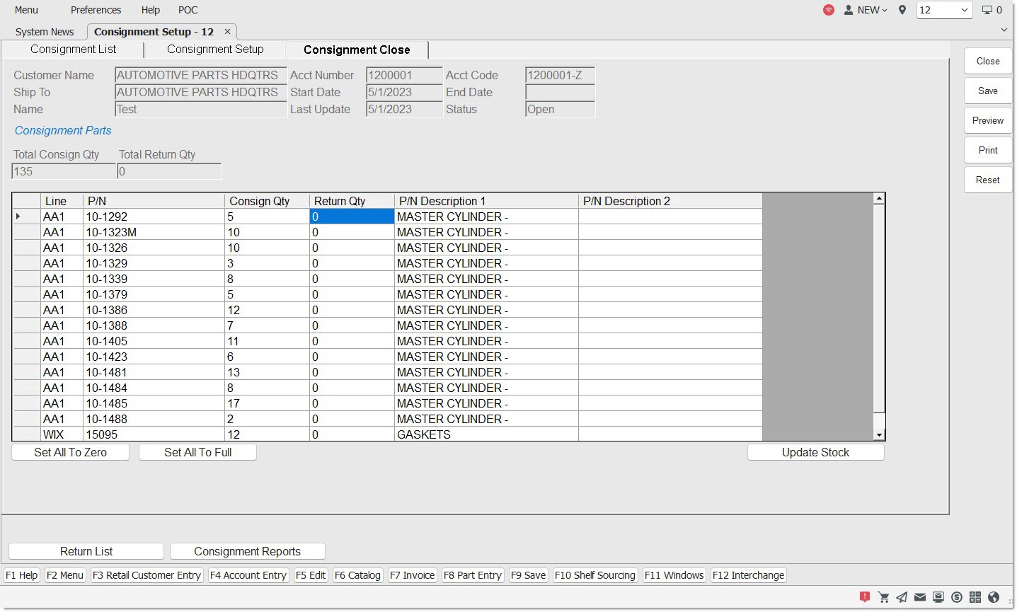 When a consignment is edited, the customer will normally return all of the parts currently on consignment to the store and the 'Consignment Close' tab is opened to end the consignment.