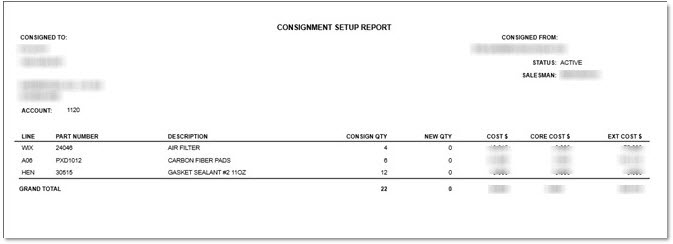 Output from the 'Preview' and 'Print' buttons on the Consignment Setup screen. The 'Consignment Setup Report' displays all parts on the consignment when saved whether stock has been updated or not.