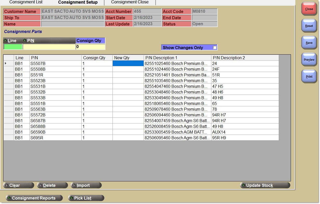 Prints the list of parts with a 'Consign Qty' on an open consignment. For edited consignments, the 'New Qty' values are not printed and only the edited parts will print.
