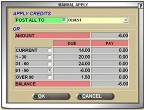 When all desired items have been checked, click 'APPLY' to apply existing unapplied credits to selected unpaid debits. Any items completely paid off are removed from the screen and any outstanding credit amount is displayed in the 'TOTAL UNAPPLIED CREDITS' field.