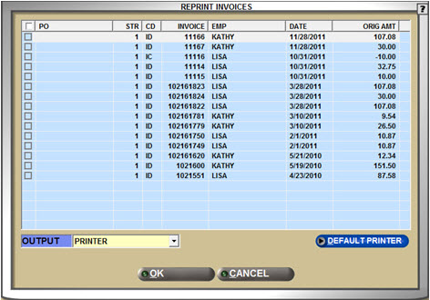 The 'REPRINT INVOICES' button allows the reprinting of multiple invoices at the same time. When clicked, the 'REPRINT INVOICES' window displays with each invoice currently available from the screen for the displayed account.