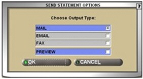 When an account is selected and the 'STATEMENT' button is clicked, the 'SEND STATEMENT OPTIONS' window displays to select the output type. The window populates based on the selected customer or store's account settings. For instance, if the selected customer or store account setting has mail selected, the 'MAIL' output type defaults to checked.