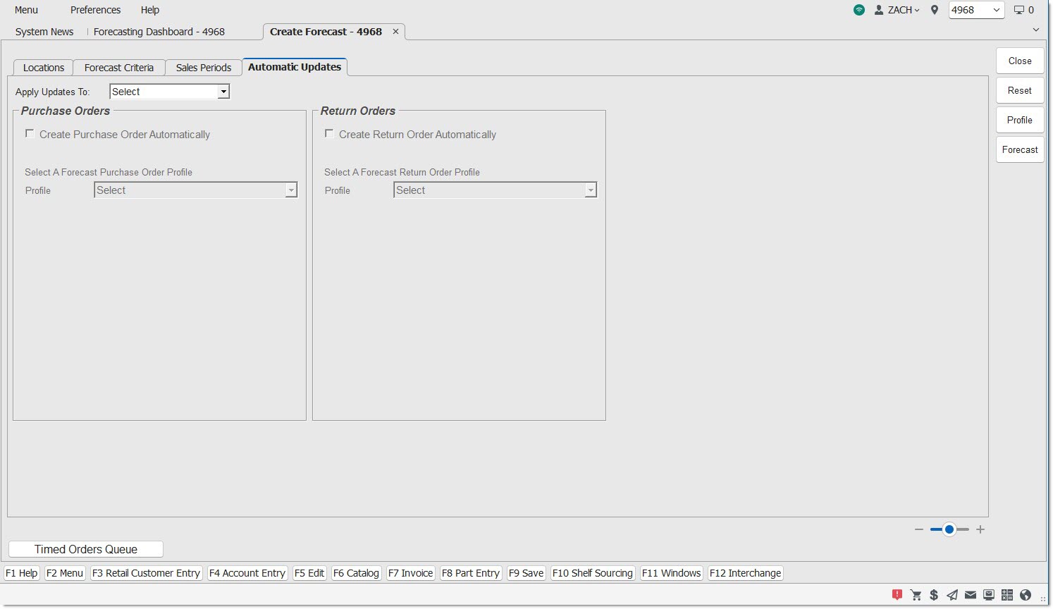 Menu Path: Inventory, Forecasting Dashboard, Forecasting Dashboard screen, 'Create New Forecast' button, 'Automatic Updates' tab