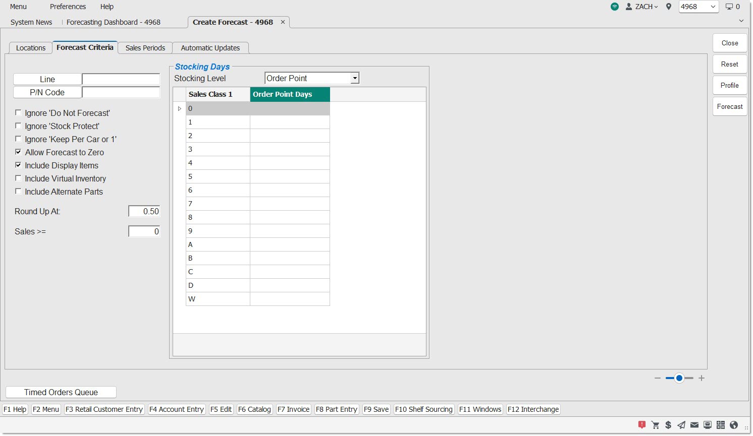 When a value of zero is entered, the forecasting routine creates a suggested stocking level of zero for items that have that 'Sales Class 1' value assigned value on the Part Entry, Order / Cost, or Part Pricing screens. Important Note: This is the only method that can be used to force suggested stocking levels to zero (regardless of whether part items have any sales or lost sales history units).