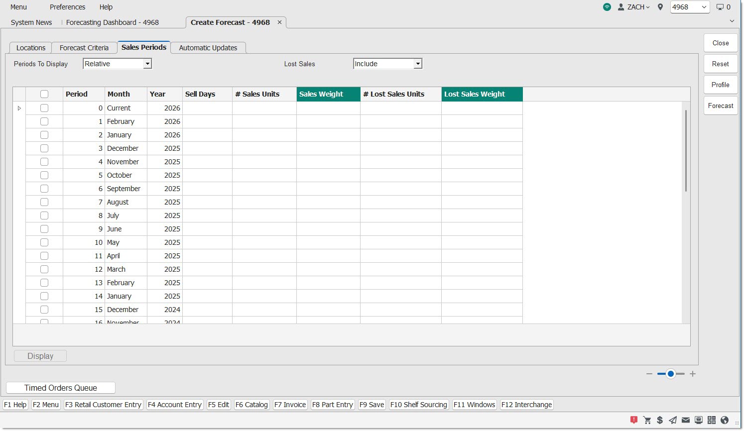 When the screen is first opened, the 'Periods to Display' and 'Lost Sales' default selections are obtained from the 'Forecasts' tab of the Store General Setup screen.