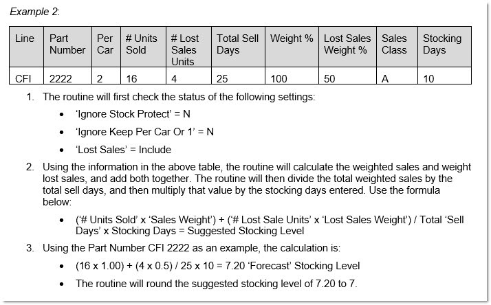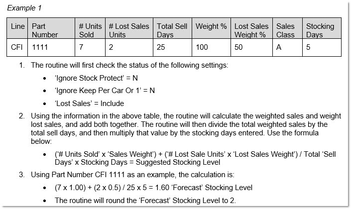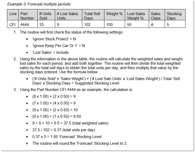 The following are examples of how the forecasting routine calculates stocking levels (using the default 'Round Up At:' value of 0.50).