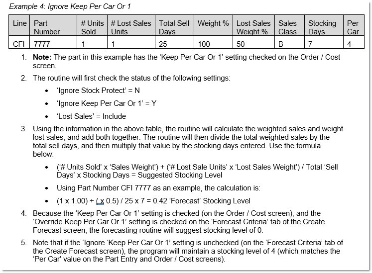 Checked – (And the 'Keep Per Car Or 1' checkbox is checked on the Order / Cost screen), the forecasting routine ignores the 'Keep Per Car Or 1' setting, and instead calculates a suggested stocking value based upon sales history and other criteria. This may result in a suggested stocking level value different than the 'Per Car' value on the Part Entry or Order / Cost screens.