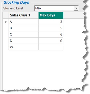 Displays all system-seeded 'Sales Class 1' values. Note: It is not possible to edit/remove any 'Sales Class 1' values from the 'Stocking Days' grid.