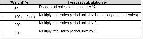 - This value can be changed to any value within the range of 0 through 999. This percentage represents the significance for the sales units within each period used for the forecast calculation.