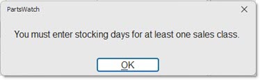 The entry of 'Stocking Days' for at least one 'Sales Class 1' (zero is an acceptable value).