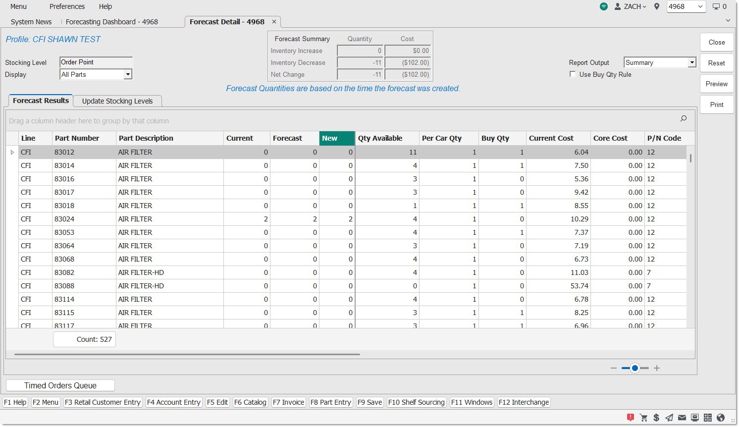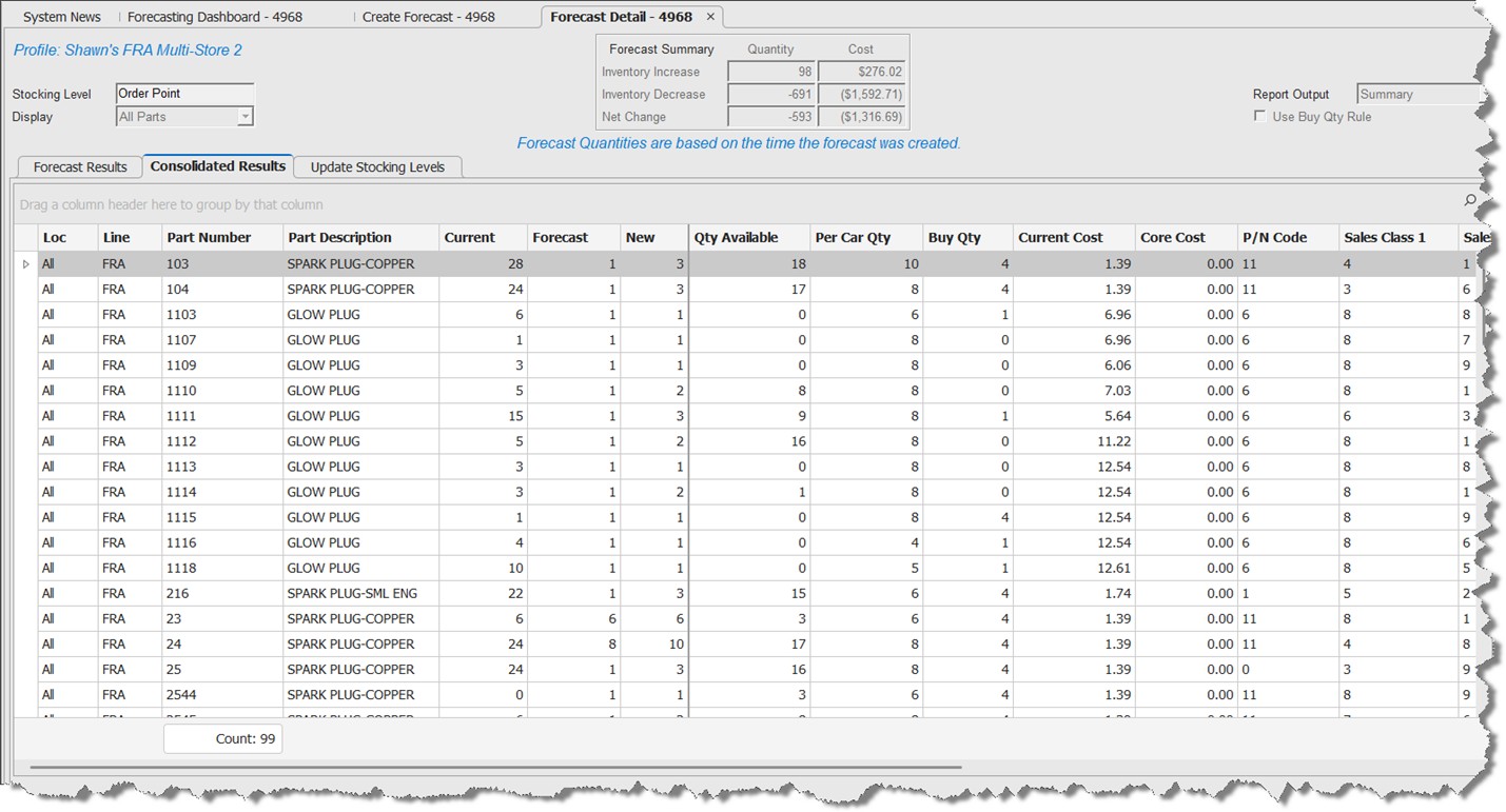 'All Parts' (default) - Shows all items within the forecast, regardless if stocking level changes were suggested or not for every part item.