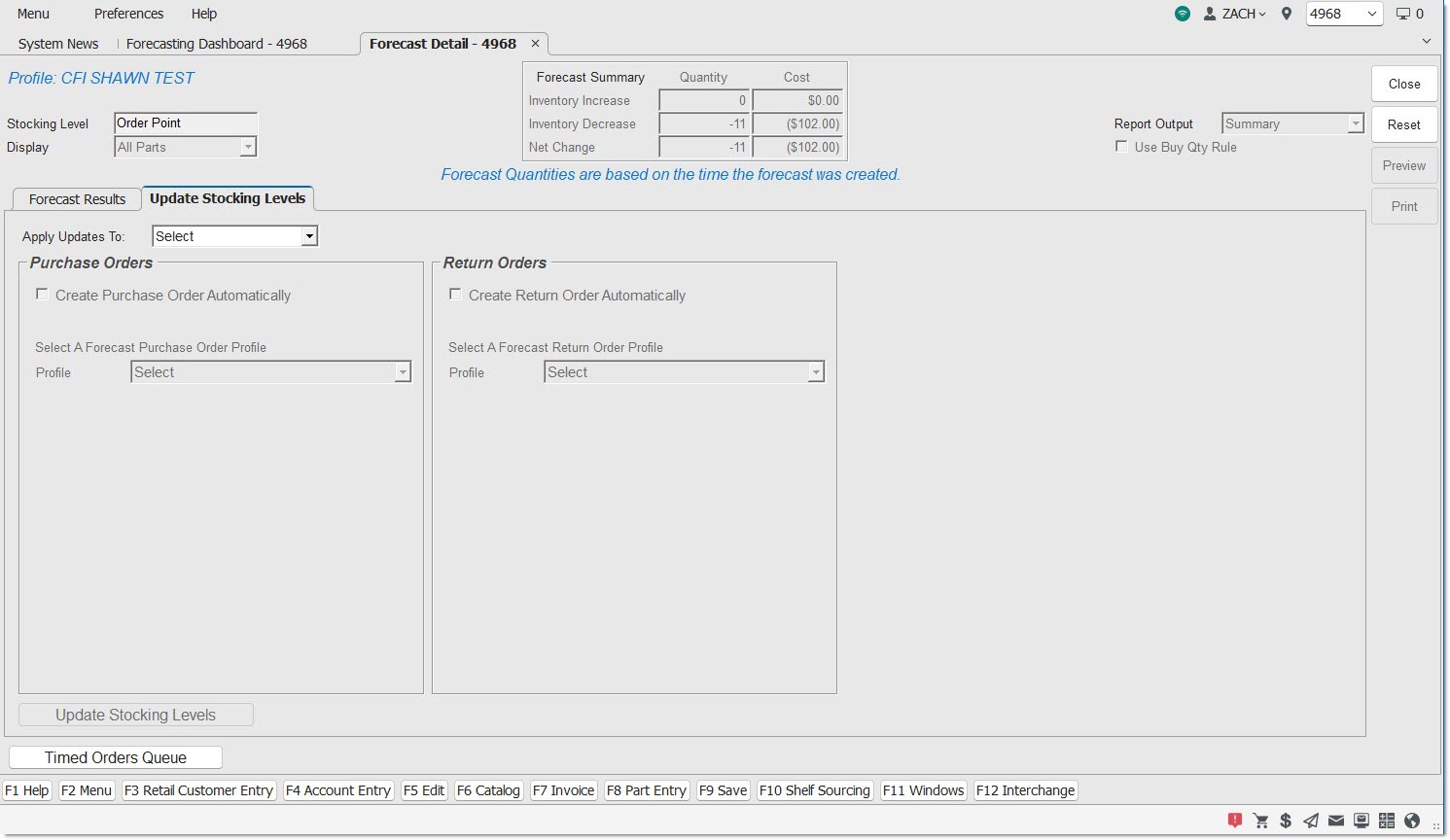 If the forecasting routine is to create a purchase order and / or a return order after all stocking levels have been updated, that information displays in the prompt.