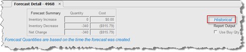 When viewing a historical forecast, the word 'Historical' is displayed in the upper-right corner of the screen, above 'Report Output'. Historical forecasts cannot be edited, they are read-only.