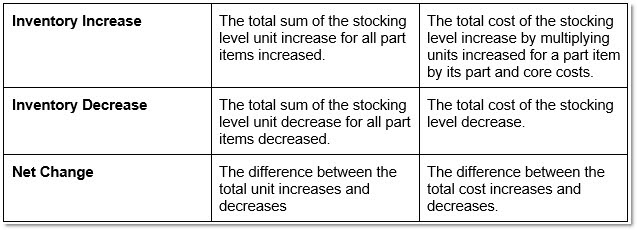 The 'Inventory Increase' and 'Inventory Decrease' totals calculates the difference between the 'Current' (stocking level) and 'New' (stocking level) units for each part item, and aggregates them together. The part cost values include part core values.