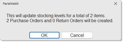 When the 'Update Stocking Levels' button is clicked, and the 'Create Purchase Order Automatically' or the 'Create Return Order Automatically' checkboxes are not checked, the application displays the following prompt:
