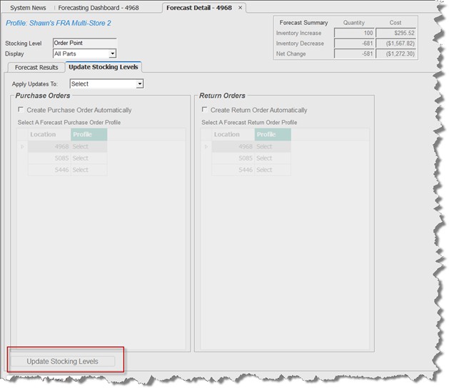 Once the forecast has been reviewed, the 'Update Stocking Levels' tab is used to manage stocking level updates, and optionally to create purchase or return orders (based on stocking level increases and/or decreases). The tab does not display for historical forecasts.