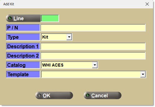 Enter or select a kit 'Line'. The Line Code must exist in the store creating the kit when the 'OK' button is clicked. If it does not, the application displays a pop-up with the message "Line code does not exist in the current store. Cannot create kit".